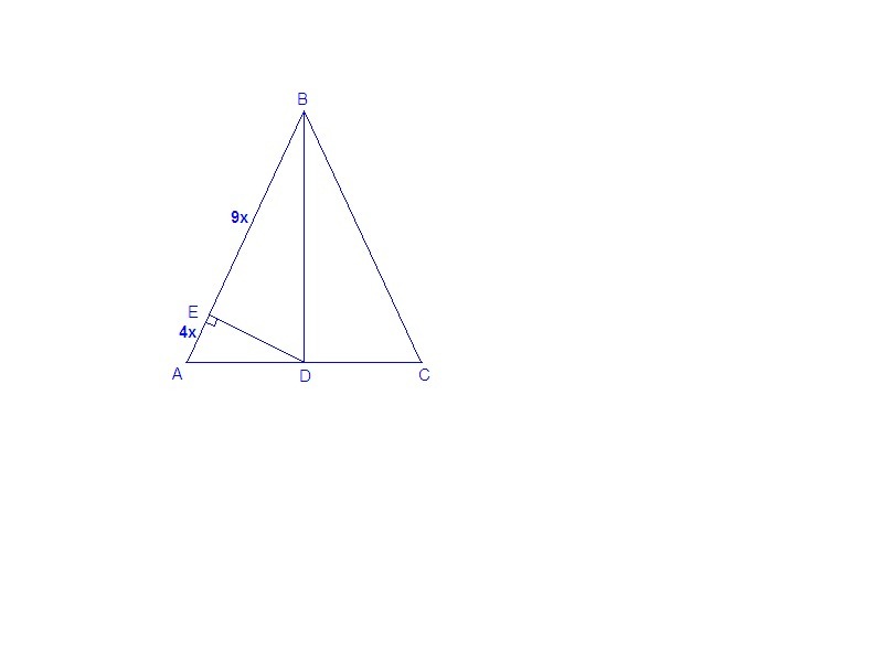 Треугольник АВС равнобедренный, значит BD биссектриса, медиана и высота, т.е. AD = DC и ΔABD прямоугольный, а DE - его высота.