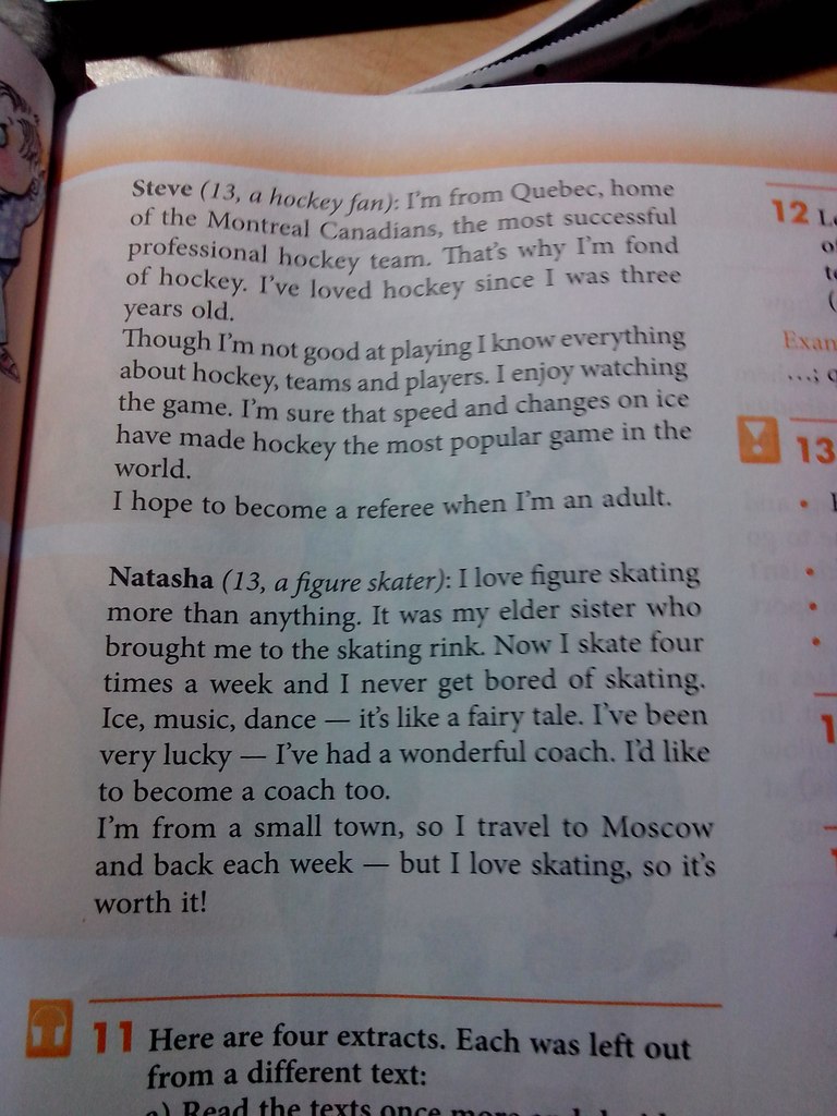 2 текст - Наташа(13, фигуристка): я люблю фигурное катание больше всего. Моя старшая сестра является тем человеком, который привел меня на каток. Сейчас я катаюсь 4 раза в неделю и мне никогда не становится скучно от катания. Лед, музыка, танцы - это как сказка. Я была очень удачлива - у меня был замечательной тренер. Я бы тоже хотела стать тренером.