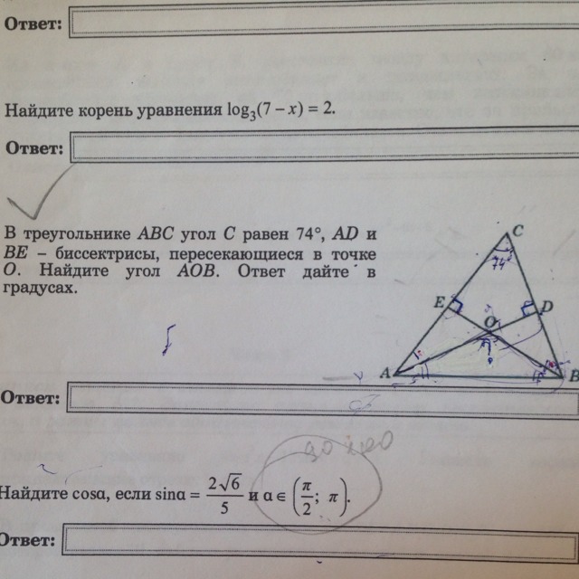 В треугольнике ABC угол С равен 74, AD и BE - биссектрисы, пересекающиеся в точке О. Найдите угол AOB. Ответ дайте в градусах.