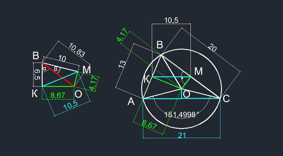 Для треугольника КВМ а = 6,5 = 13/2, в = 20/2 = 10.