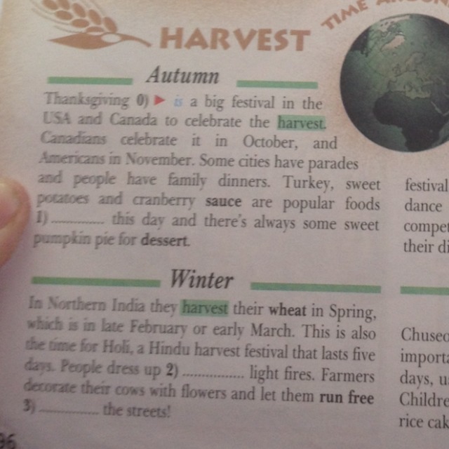 В северной Индии они собирают(?) пшеницу весной,что проходит поздним февралем или ранним мартом.Также наступает время для Холи,Хинду урожайный фестиваль,проходящий 5 дней.Люди наряжаются .... светлые огни .