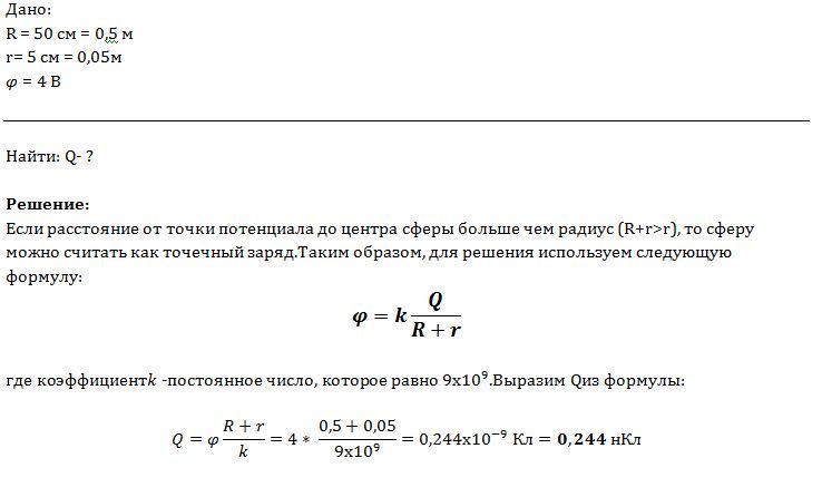 Определите заряды сферы, если потенциал в точке, расположенной на расстоянии 50 см от поверхности сферы, равен 4В.Радиус сферы 5см.