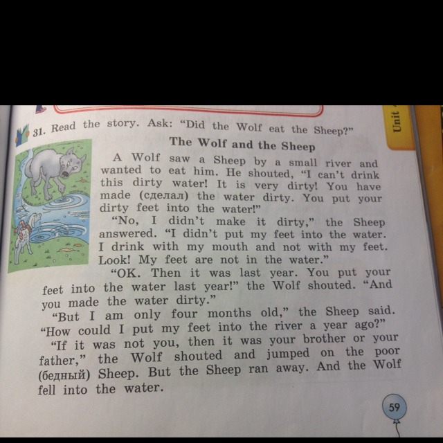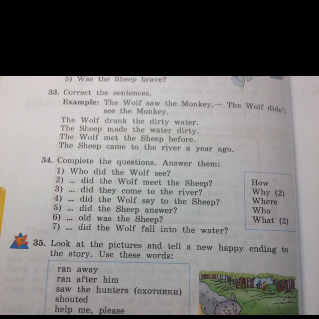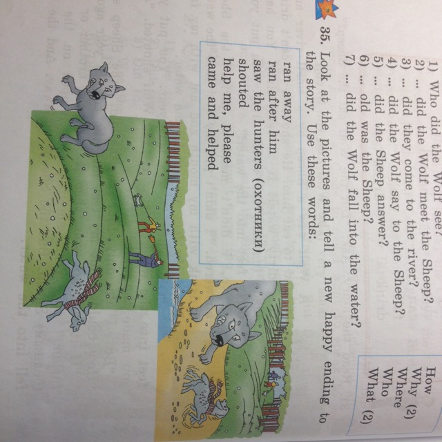 Рассказ; The Sheep ran away. The Wolf ran after him. The Sheep shouted:"Please, help me!" The hunters came and helped him. The Wolf saw the hunters and ran away and didn`t came back