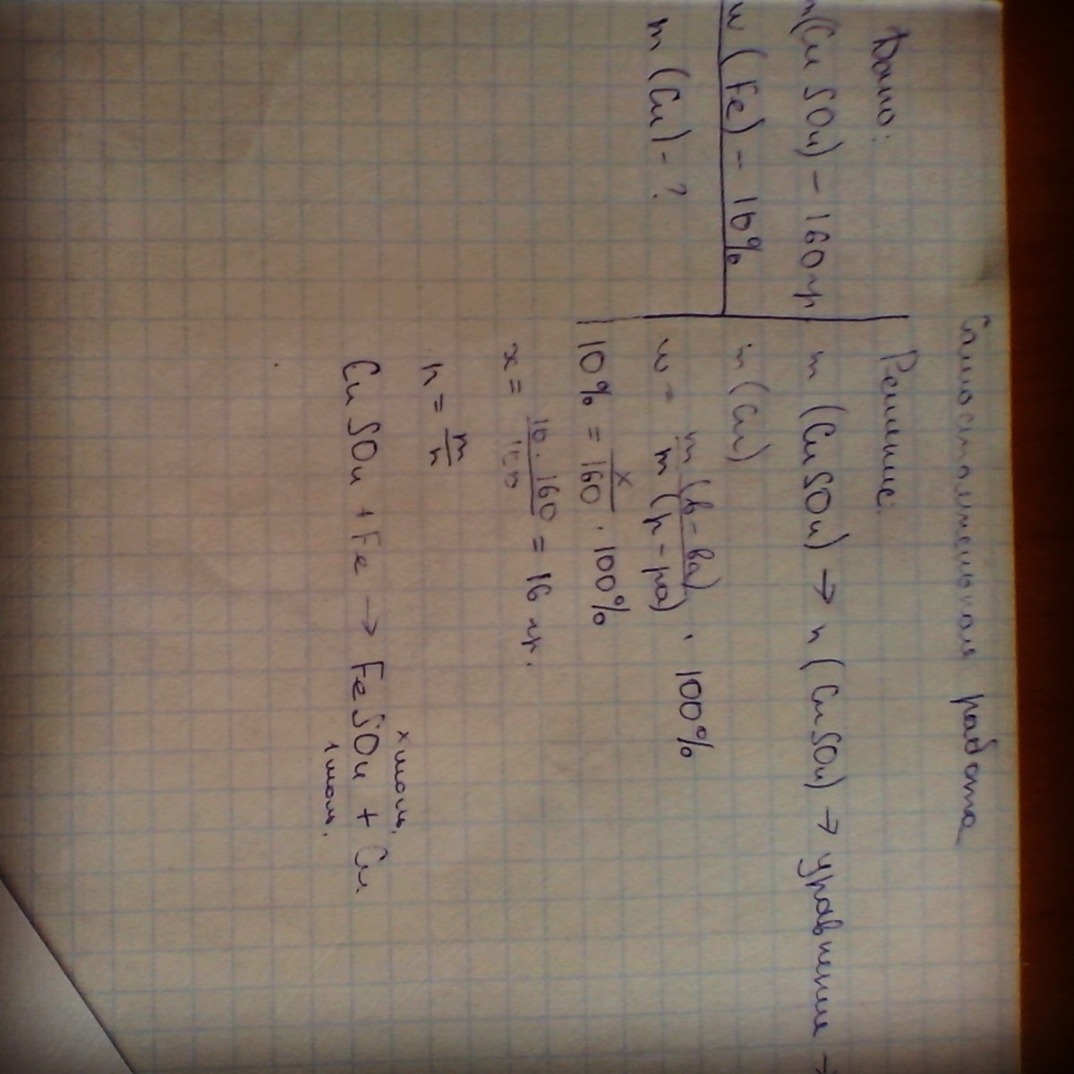 К 160 граммам 10%-ого раствора сульфата меди (||) прибавили железные опилки. Какая масса меди выделилась?