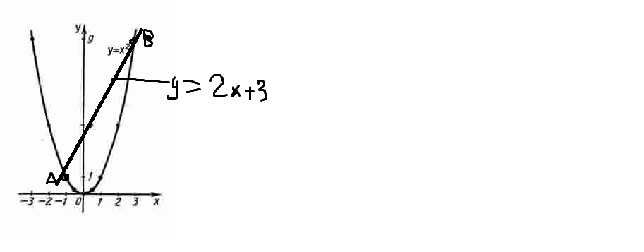 у = 2х + 3 . Они пересекаются в двух точках А(- 1; 1) и В(3; 9). Корнями уравнения служат абсциссы точек А и В, значит, х1 = -1, х2 = 3.