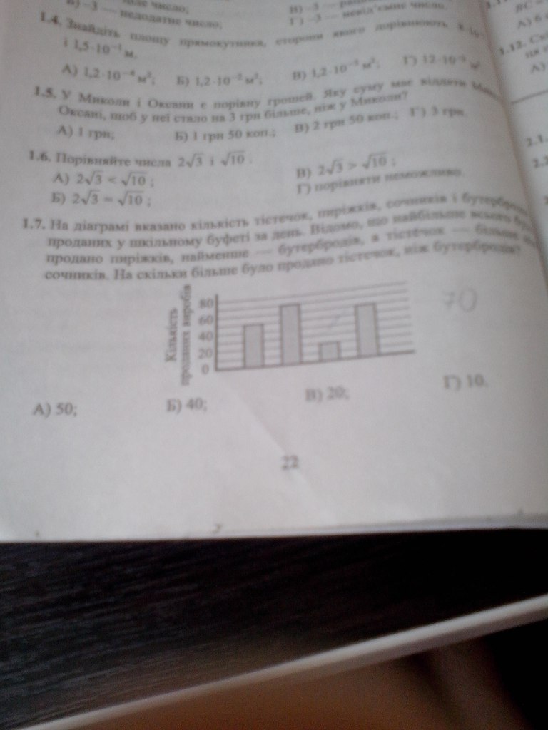 На діаграмі вказано кількість тістечок,пиріжків,сочників,і бутербродів,проданих у шкільному буфеті за день.Відомо,що найбільше всього було продано пиріжків,найменше-бутербродів,а тістечок-більше ніж сочників.на скільки більше було продано тістечок,ніж бутербродів.
