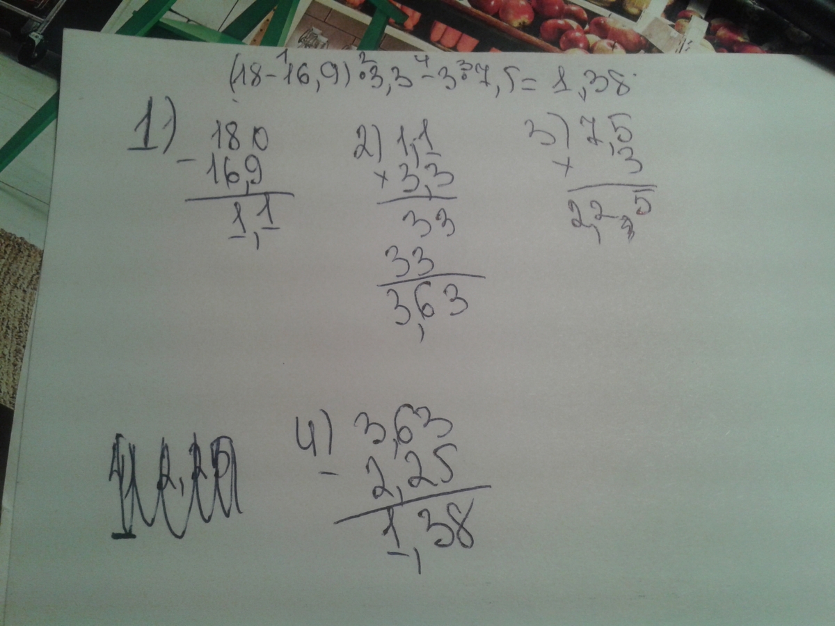 18-16,9=1,1 1,1×3,3=3,63 7,5×3=2,25 3,63-2,25=1,38