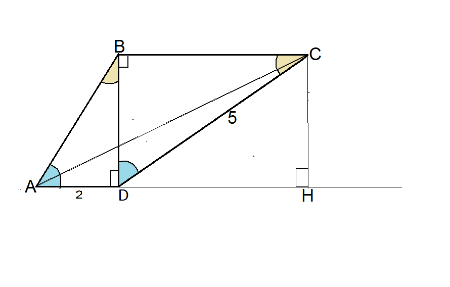 В трапеции ABCD меньшая диагональ BD перпендикулярна основаниям AD и BC, сумма острых углов A и С равно 90. Найдите длину большей диагонали трапеции, если основание AD=2, DC=5.