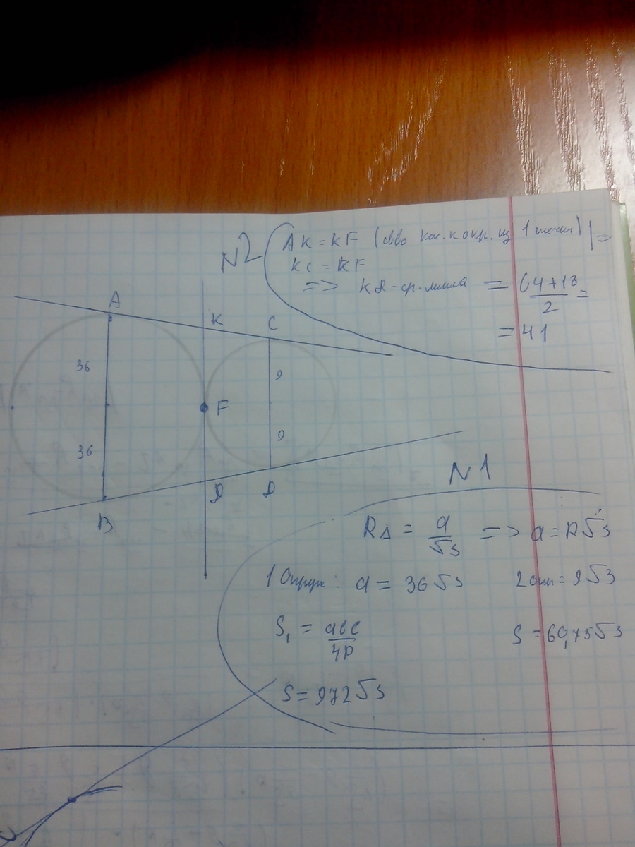Две окружности с радиусами 36 и 9 касаются внешним образом. Найдите площадь правильного треугольника, вписанного в окружность, касательную к двум данным окружностям и к их общей внешней касательной.