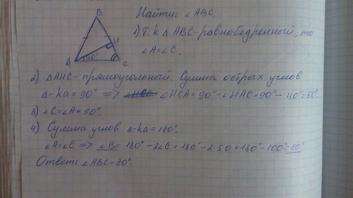 В равнобедренном треугольнике АВС угол между высотой АН, опущенной на боковую сторону треугольника. и его основанием АС равен 40 (градусов) . Найдите угол 9 в градусах) АВС.