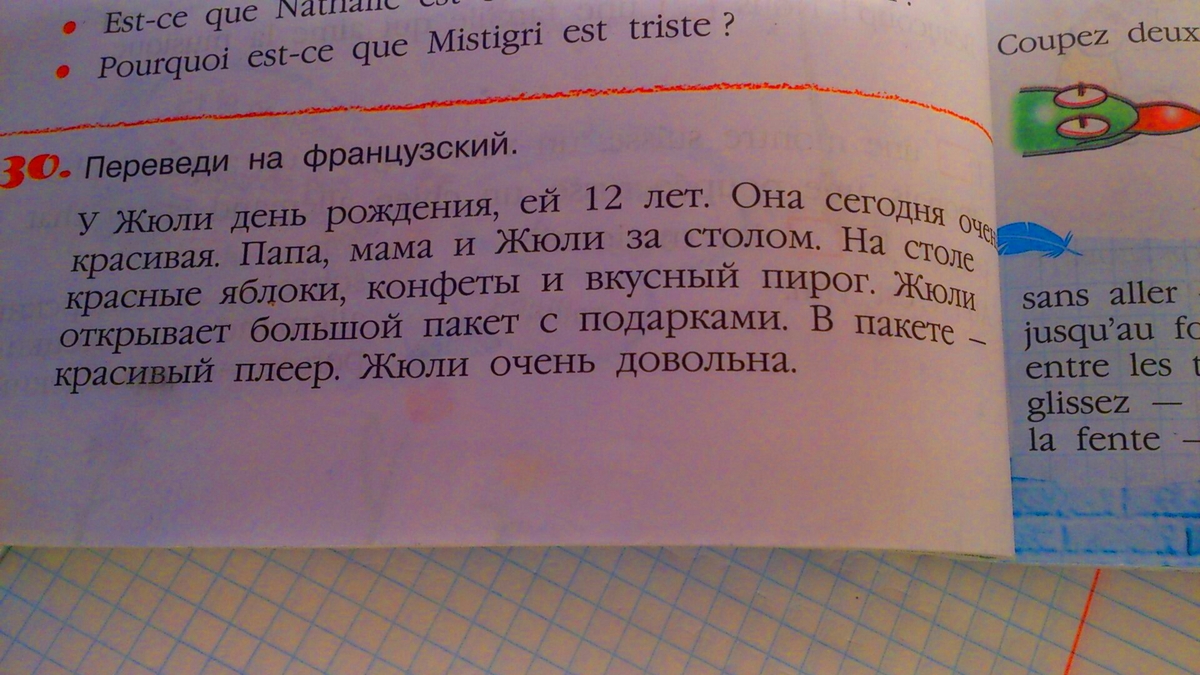 À l'anniversaire de Julie, elle ... ans. Aujourd'hui, elle est très belle. Maman, papa et Julie à la table. Sur la table des pommes rouges, des bonbons et délicieuse tarte. Julie ouvre un gros sac de cadeaux. Le paquet est un beau joueur. Julie est très heureux.
