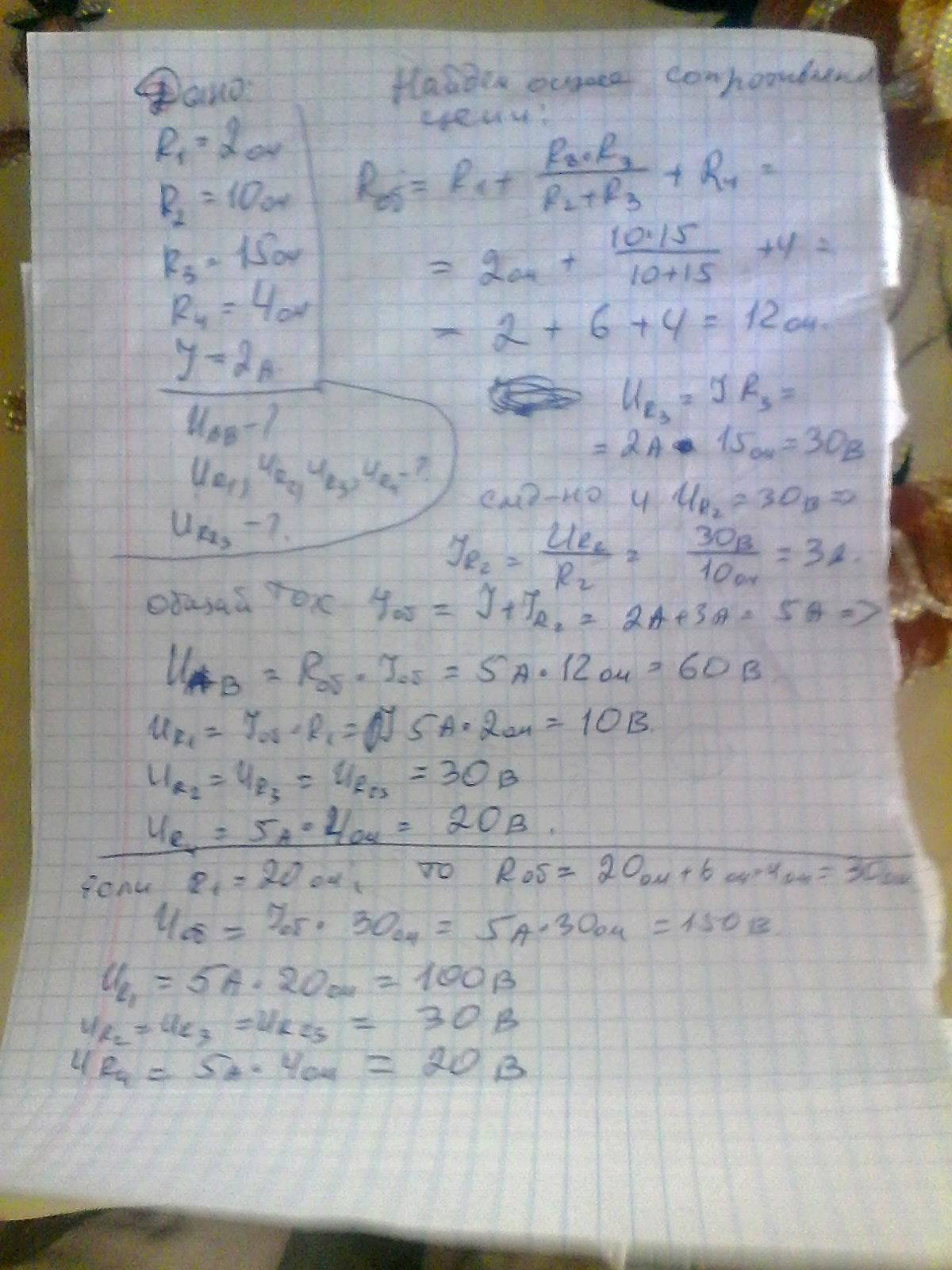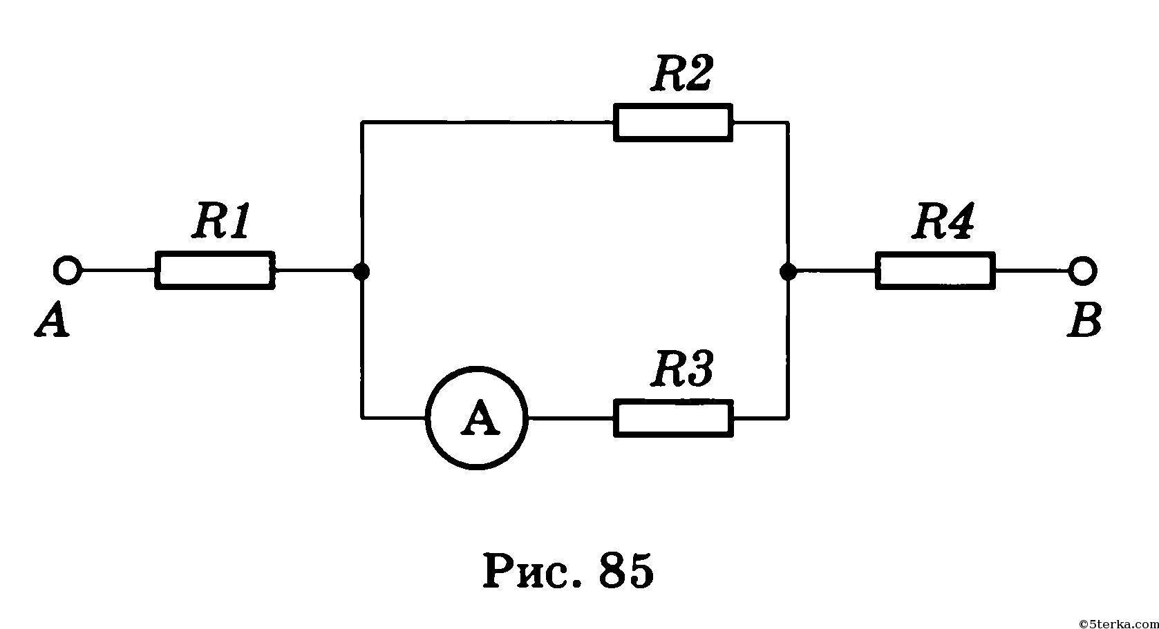 найдите распределение токов и напряжений на каждом сопротивлении если R1=20, R2=10,R3=15,R4=4 и амперметр показывает 2А. какое напряжение между точками?