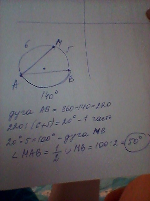 Точки А и Б разделяют окружность на две дуги, меньшая из которых равна 140°, а большая точкой М делится в отношении 6:5, считая от точки А. Найдите угол ВАМ.