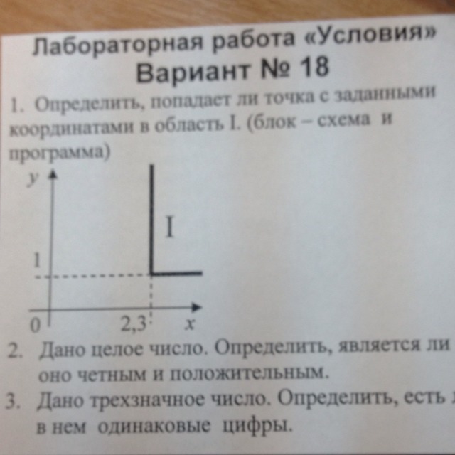 if (x>2.3) and (y>1) then write('точка попадает в заданную область') else