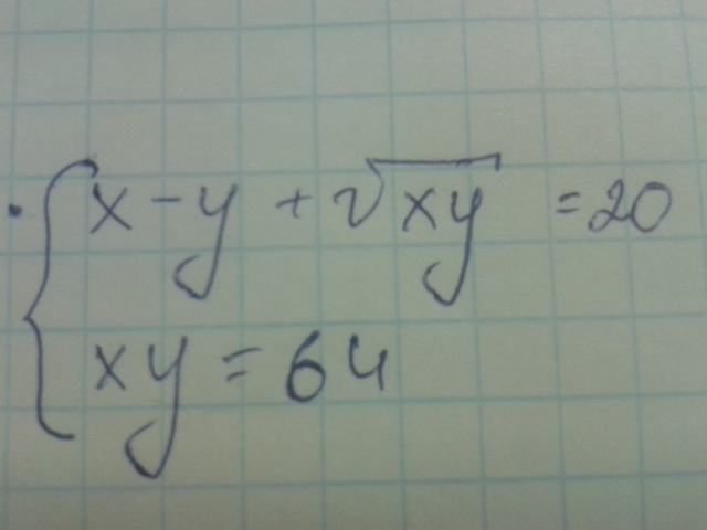 left { {{x-y+ sqrt{xy}=20 } atop {xy=64}} right. \  left { {{x-y+ sqrt{xy}=20 } atop {sqrt{xy}=8}} right. \  left { {{x-y+8=20} atop {xy=64}} right. \ left { {{x=y+12} atop {xy=64}} right. \ y(y+12)=64\ y^2=12y-64=0\ D=144+256=400\ y1=4    y2=-16\  left { {{y1=4} atop {x1=16}} right.      left { {{y2=-16} atop {x2=-4}} right.