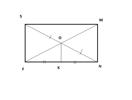 В треугольнике FSN ОК является средней линией, т.к. соединяет середины сторон треугольника. SO=ON, поскольку диагонали прямоугольника делятся точкой пересечения пополам, FK=KN по условию. Значит ОК параллельна FS и равна половине этой стороны,