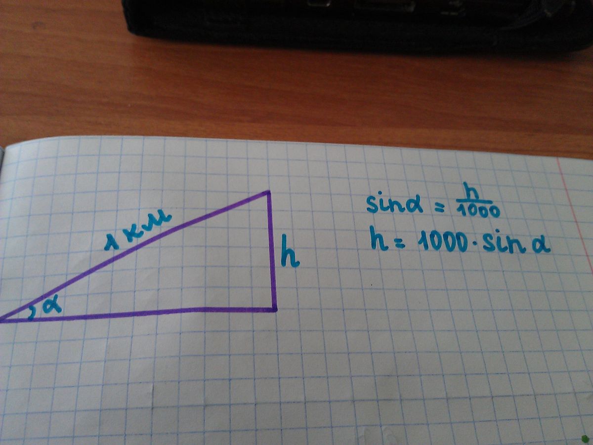 найти высоту(h) на которую поднялся пешеход прошедший 1км по прямой дороге, поднимающийся под углом альфа к горизонту.