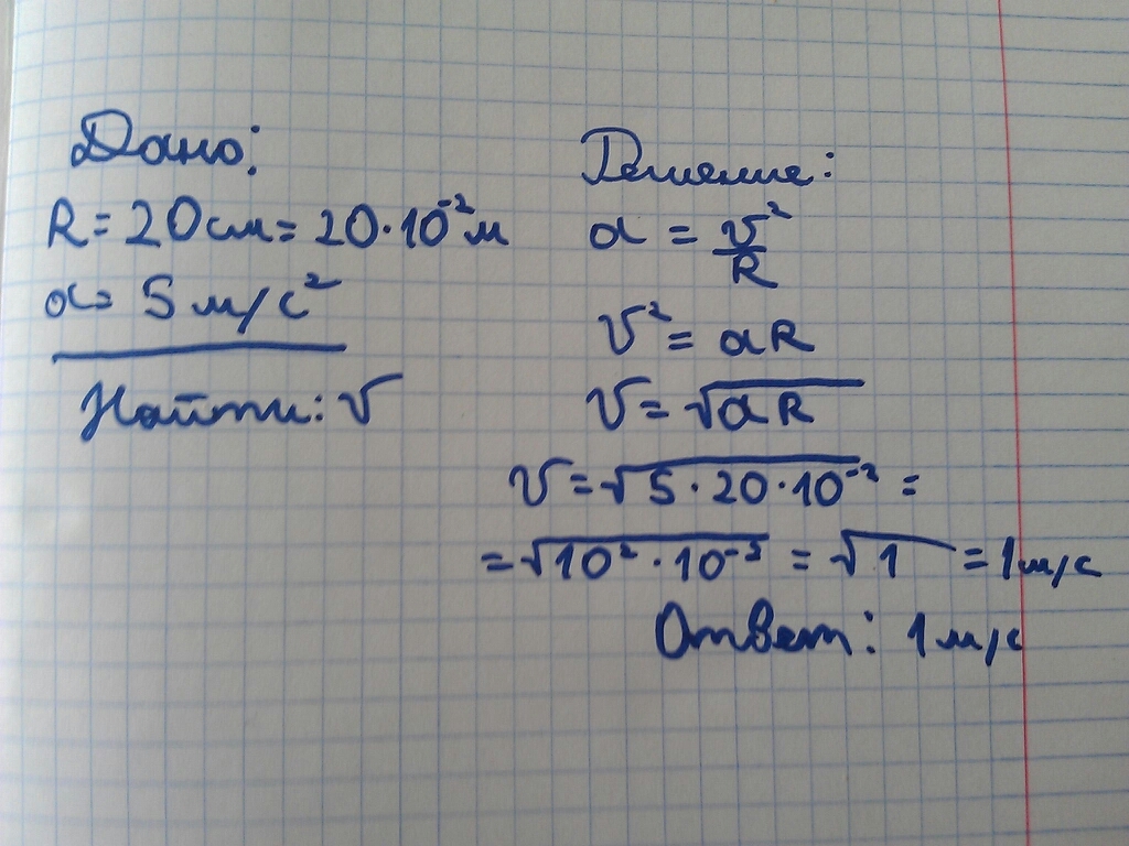 автомобиль движется по закруглению дороги радиусом 20см с центоростремительным ускорением 5м/с в квадрате. Определить скорость автомобиля