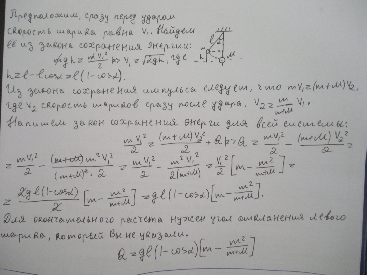 Два шарика, массы которых m=0,1кг и М=0,2кг, висят, соприкасаясь, на вертикальных нитях длиной l=1,5 м(см.рис.). Левый шарик отклоняют на угол и отпускают без начальной скорости. Какое количество теплоты выделиться в результате абсолютно неупругого удара шариков? с объяснением пожалуйста...