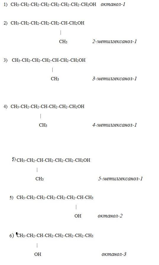 C8H17OH - октанол. Нужно придумать 6 изомеров по общей формуле и дать название. Кто шарит в этом помогите, буду очень благодарен