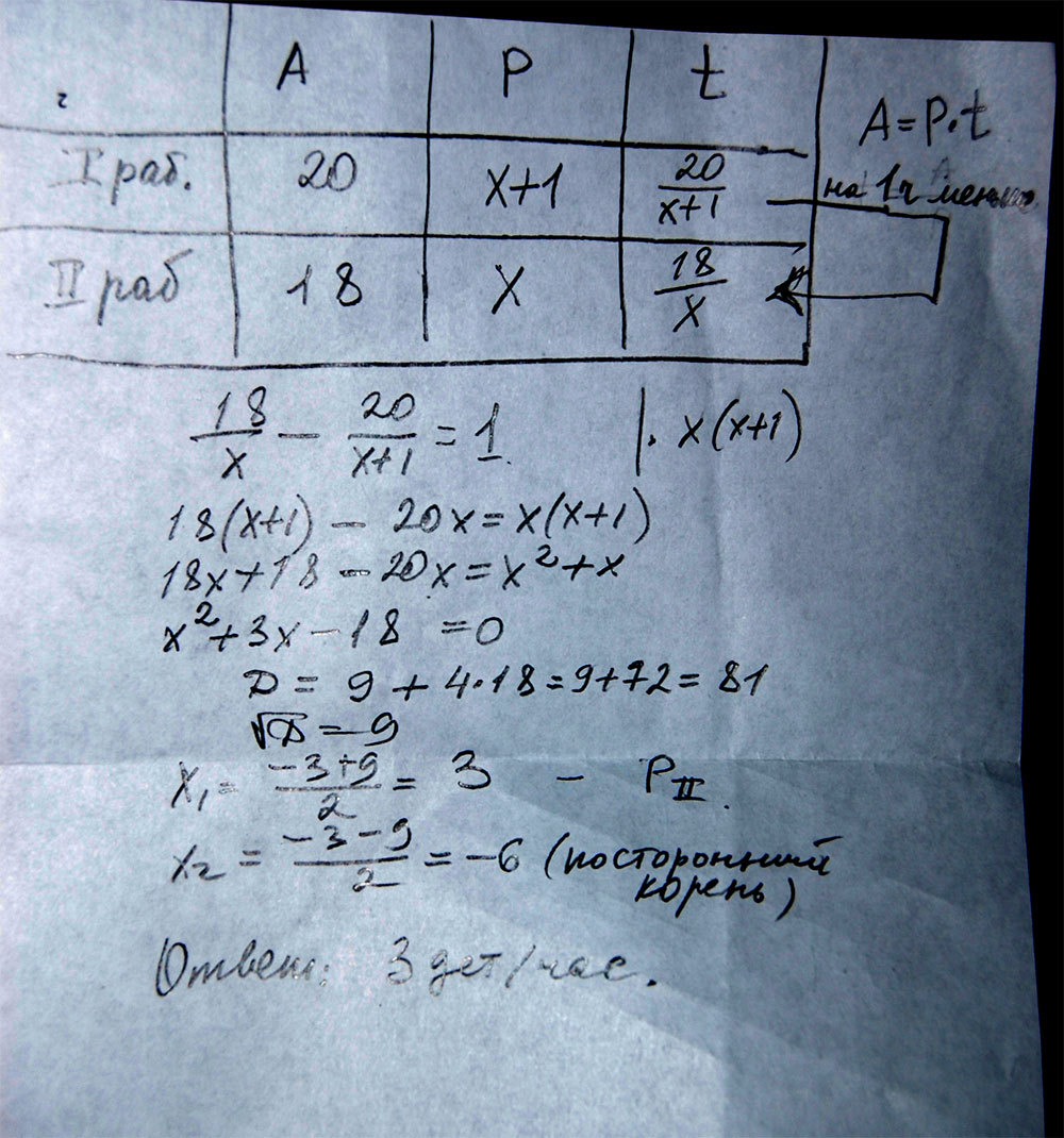 на изготовление 20 деталей первый рабочий тратит на 1час меньше чем второй рабочий на изготовление 18 таких же деталей. известно что второй рабочий за час делает на 1 деталь меньше чем первый рабочий. сколько деталей в час делает второй рабочий?