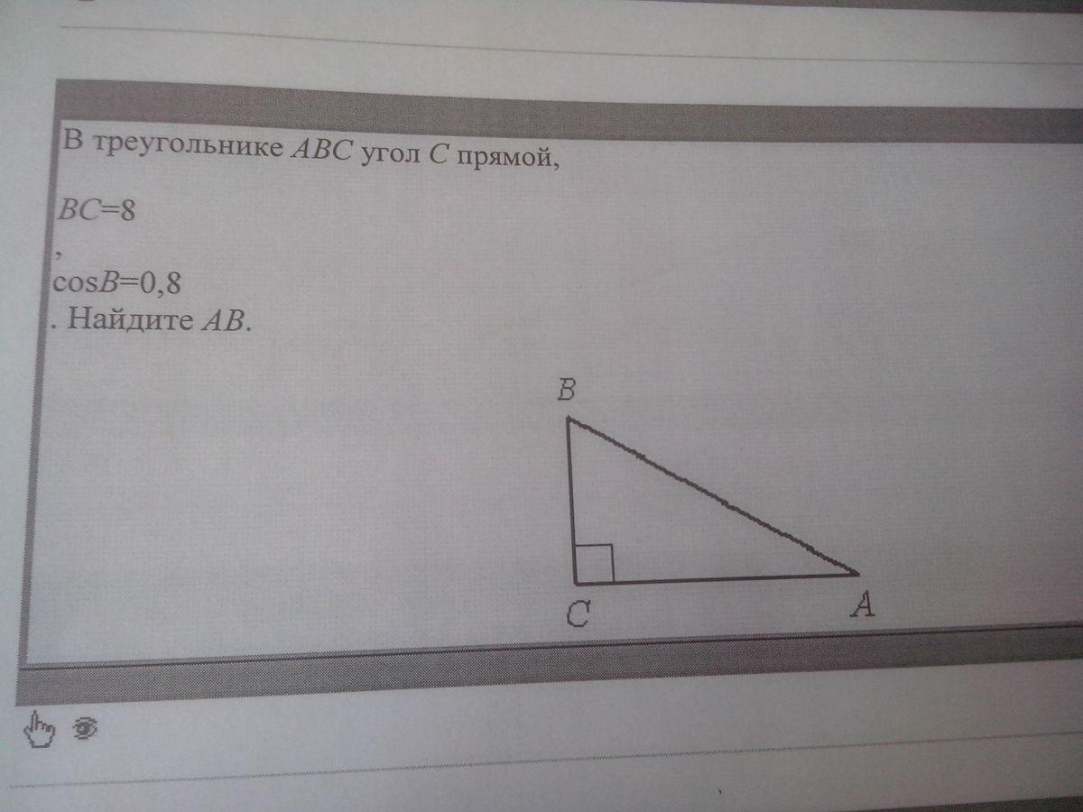 помогите решить!!! в треугольнике авс угол с прямой, вс - 8 косинусВ- 0.8 найти ав