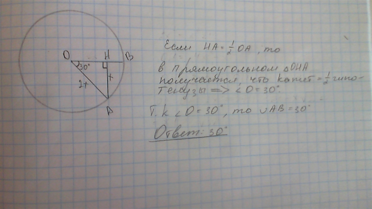 отрезки ОА и ОВ - радиусы окружности, расстояние от точки А до прямой ОВ в два раза меньше радиуса. Найдите дугу АВ