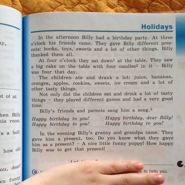 В четыре часа они сели за стол. Там перед ними стоял торт с четырьмя свечками, т.к. Билли было 4 года.
