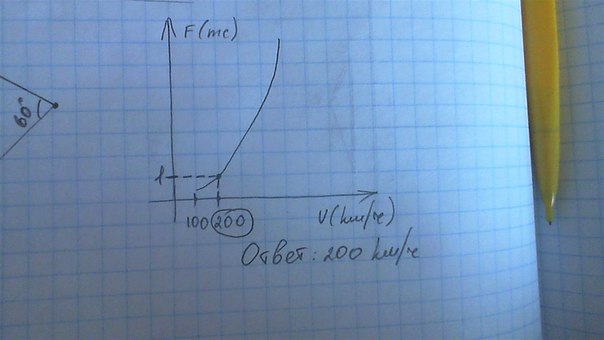 Проведем пунктир к графику от значения "1" на оси ординат (Oy).Поставим точку на графике. После этого, спускаемся перпендикулярно к оси абцисс (Ox). Попадаем в точку 200 км/ч