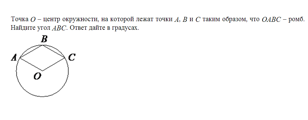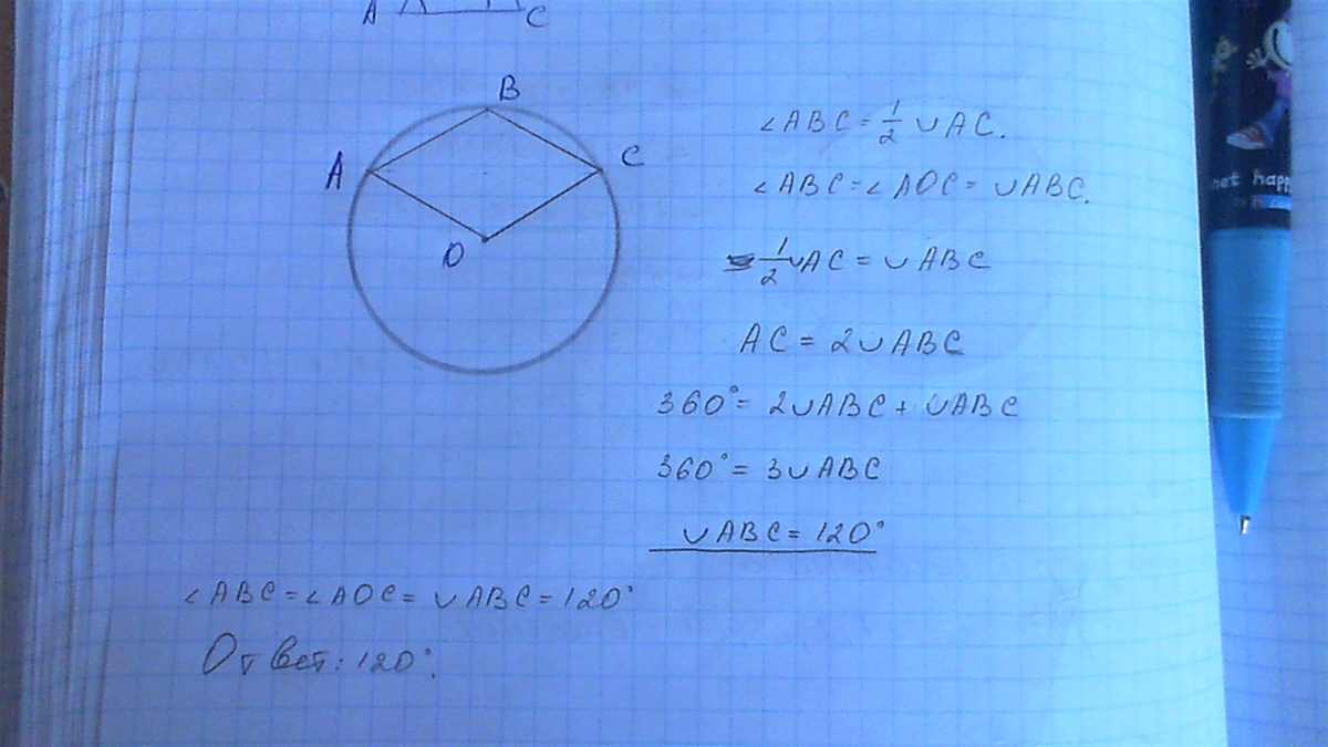 проведем ОВ. Треугольник ОВА - равносторонний. Значит, угол АВО = 60. Тогда АВС в два раза больше. <ABC=120°