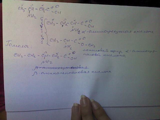 Запишите структурные формулы В-аминобутановой кислоты,двух её изомеров разных видов и одного гомолога. Назовите изомеры и гомолог.