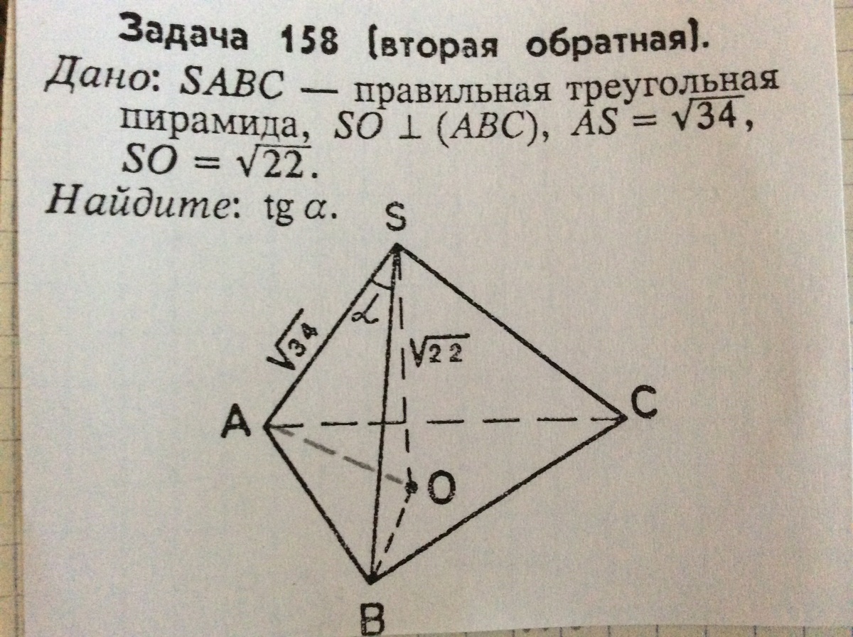SABC - правильная треугольная пирамида, SO перпендикулярно АВС, АS=√34, SO=√22. Найти tgα. Рисунок есть во вложении
