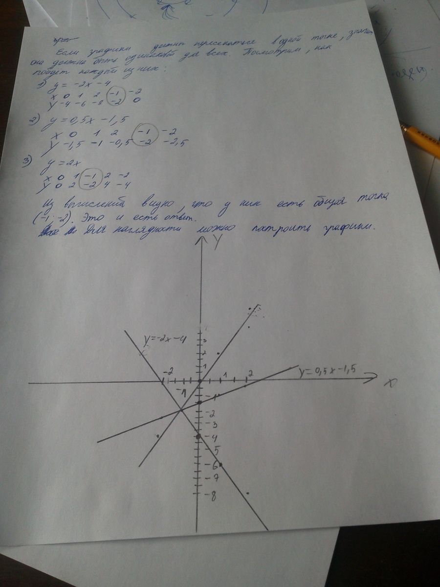Докажите, что график функций y= -2x - 4, y= 0,5x - 1,5 и y= 2x пересекаются в одной точке
