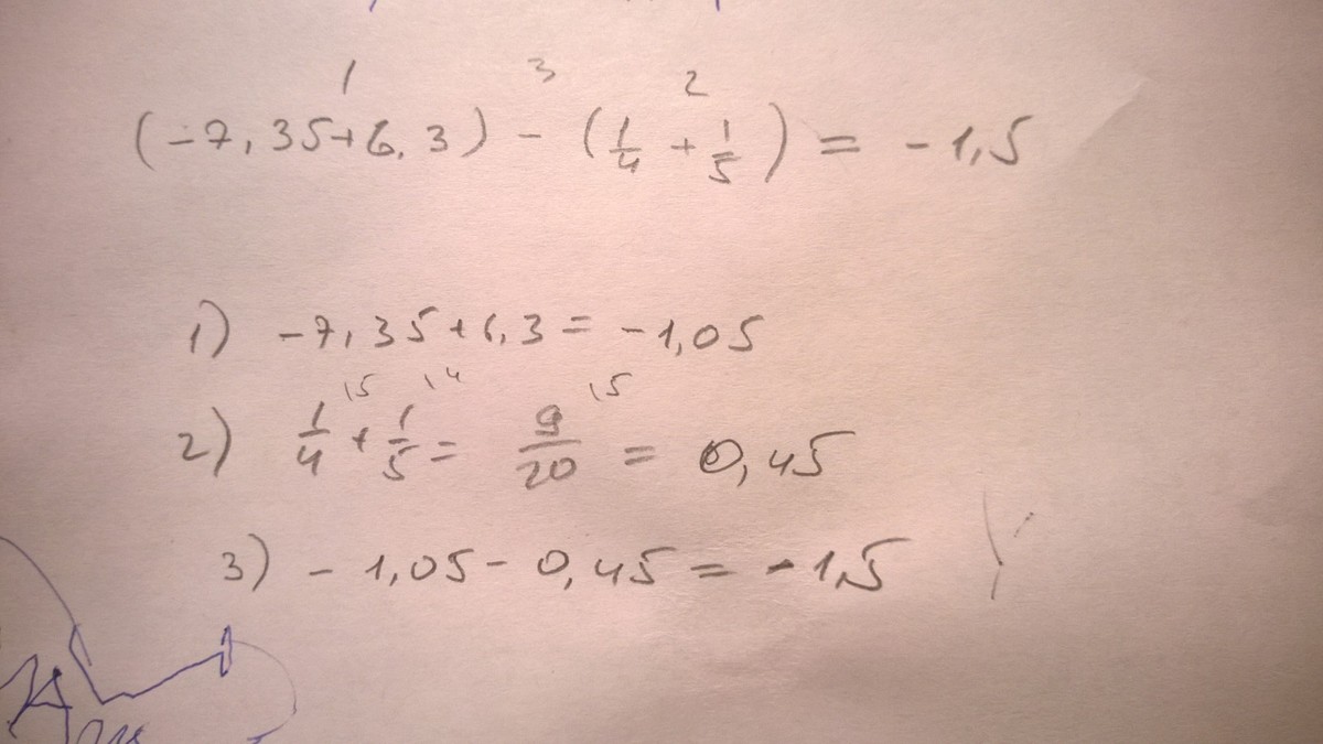 (-7.35+6.3)-(1/4+1/5)=-1.05-9/20=-1.05-0.45=-1.5