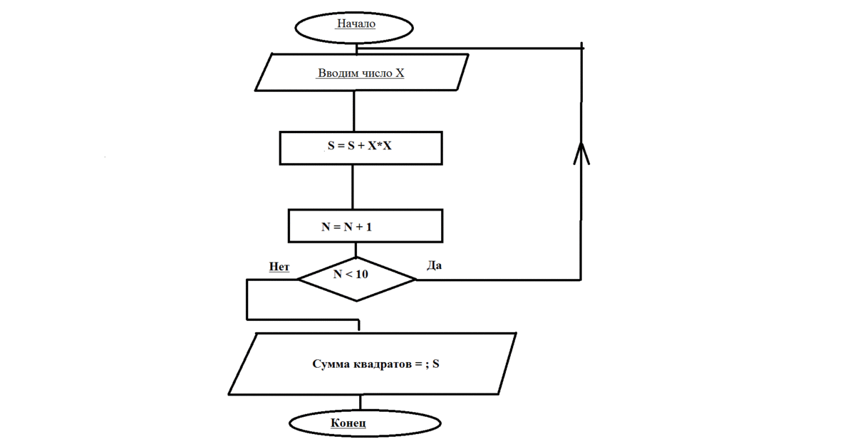 2) Алгоритм вычисления суммы квадратов десяти производных чисел, водимых с клавиатуры в процесс выполнения алгоритма.