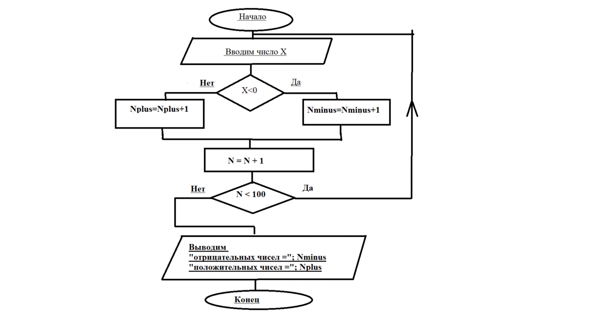 1) Вводятся 100 чисел.Определить сколько среди них положительных и сколько отрицательных.(Числа вводятся в одну переменную в цикле)