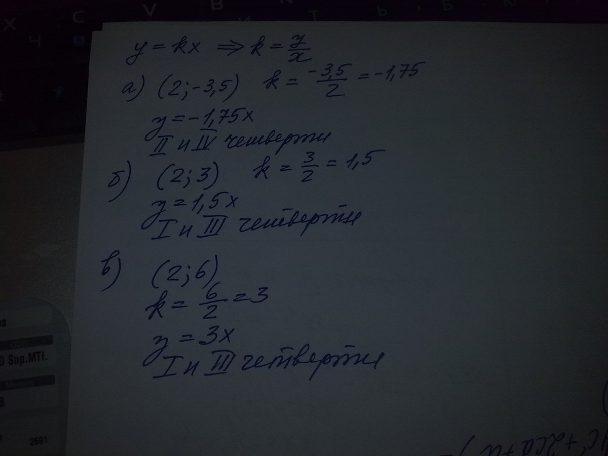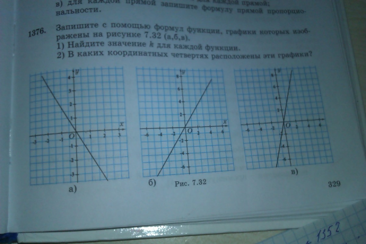 Запишите с помощью формул функции, графики которых изображены на рисунке 7.32 ( А,б,в) Найдите значение K для каждой функции. В каких координатных четвертях расположены эти графики