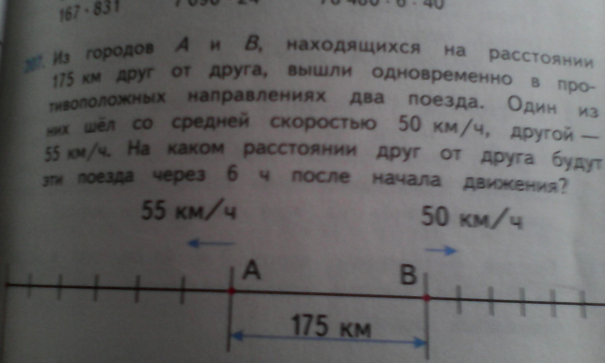 из города А и В находяхщихся на растоянии 175км друг от друг от друга вышли одновременно в противоположных направлениях два поезда.Один из них шёл со средней скоростью 50км/ч,другой-55км/ч.На каком растоянии друг от друга будут эти поезда через 6 ч после начала движения