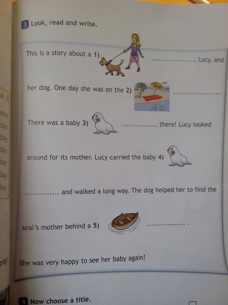 1 girl, 2 beach, 3 seal 4 seal 5 boat