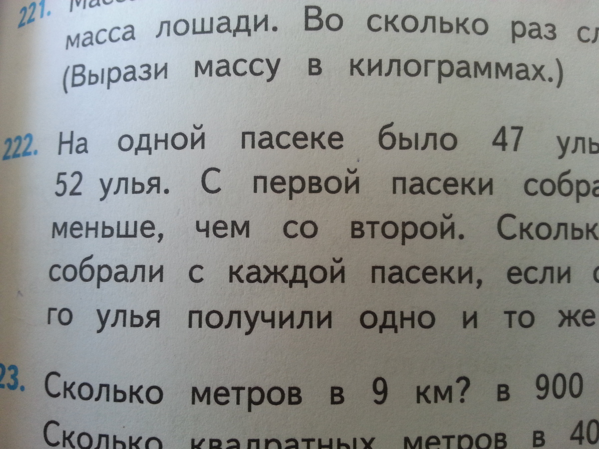 на одной пасеке было 47ульев а на другой52улья. с первой посеки собрали на350кг мёда меньше чем со второй. сколько кг мёда собрали с каждой пасеки если считать что с каждого улья получили одно и то же количество мёда?