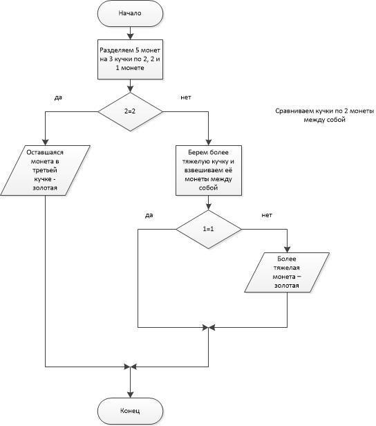 Кот Матроскин и пёс Шарик нашли клад, который состоял из 5 одинаковых монт. В коробке, в которой лежали монеты, друзья обнаружили записку: "При помощи чашечных весов без гирь найдите среди этих 5 монет одну золотую и купите почтальону Печкину велосипед. Сделайте это при помощи двух взвешиваний. Золотыя монета более тяжёлая". Дядя Фёдор помог своим друзьям справится с этим заданием. Как он действовал? Впишите действия Дяди Фёдора в блок схему.