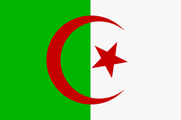 Государственный флаг Алжира состоит из двух вертикальных полос одинаковой ширины зелёного и белого цвета. В центре расположены красная звезда и полумесяц. Флаг принят 3 июля 1962 года.