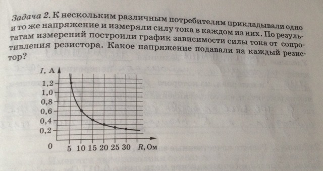 Задача 2. К нескольким различным потребителям прикладывали одно и то же напряжение и измеряли силу тока в каждом из них. По результатам измерений построили график зависимости силы тока от сопротивления резистора. Какое напряжение подавали на каждый день резистор?