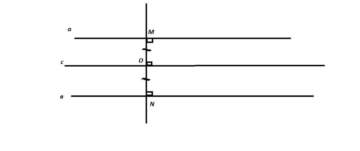 Проведём перпендикуляр МN к параллельным прямым а и в. Через середину