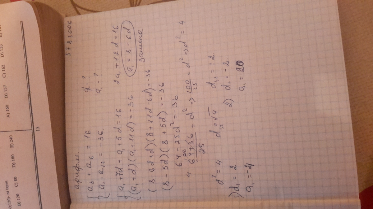 Сумма восьмого и шестого членов арифметической прогрессии равна 16 а произведение второго и двенадцатого равно -36. НАйдите разность и первый член прогрессии. ПОЛНОЕ РЕШЕНИЕ , ПОЖАЛУЙСТА.