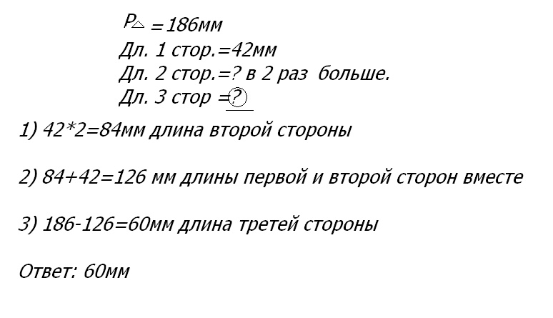 Периметр трикутника 186 мм. Довжина однієї сторони 42 мм, друга сторона у два рази більша від неї.Чому дорівнює 3 сторона трикутника!!!