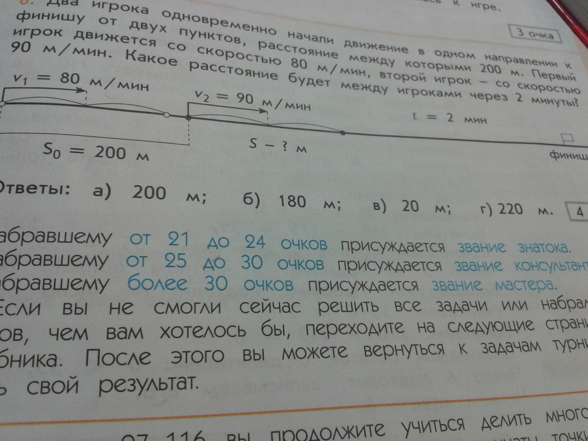 Два игрока одновременно начали движение в одном направлении к финишу от двух пунктов, расстояние между которыми 200 м . Первый игрок движется со скоростью 80м/мин, второй игрок - со скоростью 90м/мин . Какое расстояние будет между играками через 2 минуты?