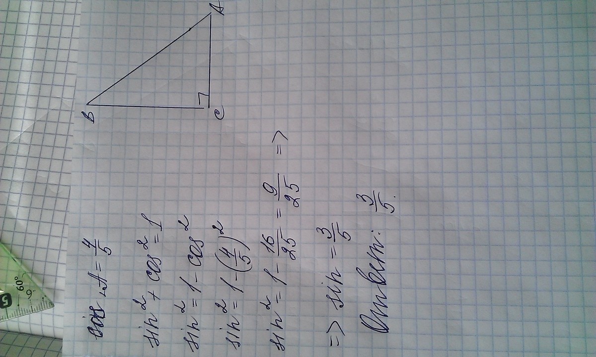 В прямоугольном треугольнике косинус угла между гипотенузой и катетом равен 4/5.Чему равен синус этого угла?