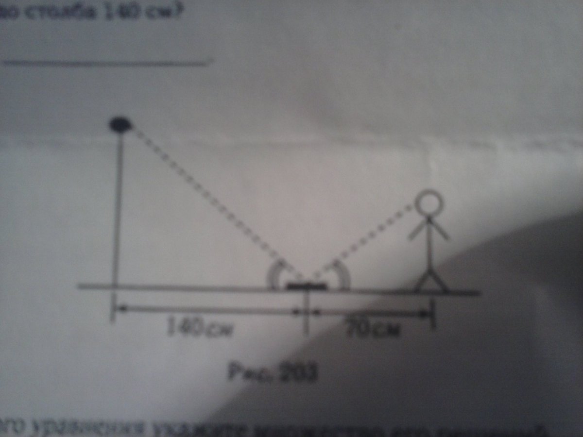 на рисунке 203 изображен человек ростом 165 см и фонарный столб. человек видит верхушку столба в небольшое зеркало лежащее на земле в 70 см от его ног.Сколько сантиметров составляет высота столба если от зеркала до столба 140 см?