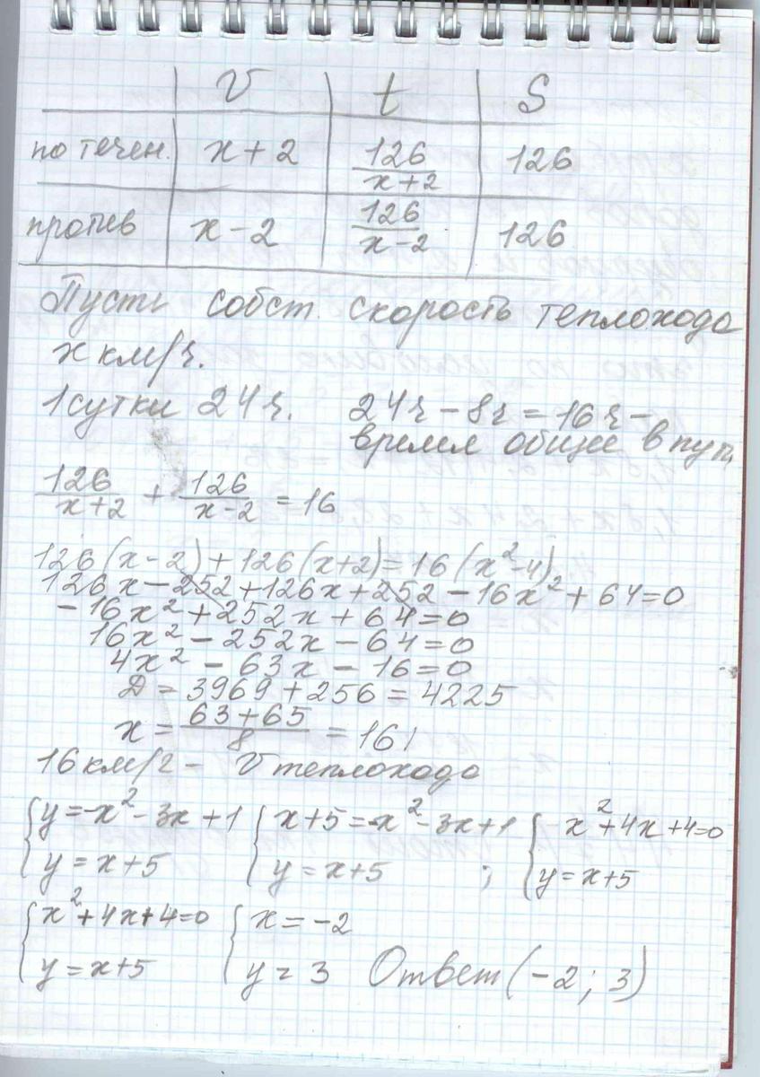 Теплоход проходит по течению до пунктаназначения 126 км и после стоянки возвращается в пункт отправления,найдите скорость теплохода в неподвижной воде,если скорость течения 2 км/ч,стоянка длилась 8 ч,а в пункт отправления теплоход возвращался ровно через сутки после отплытия из него,ответ в км/ч